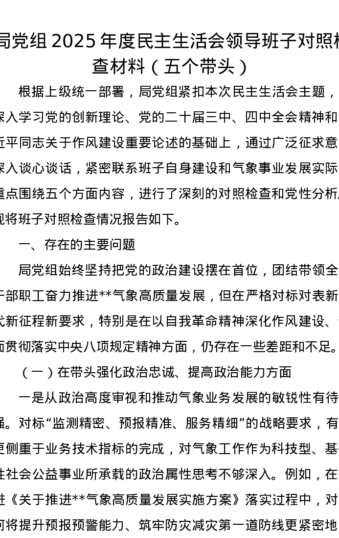 局党组2025年度xxxxx领导班子对照检查材料(五个带头)