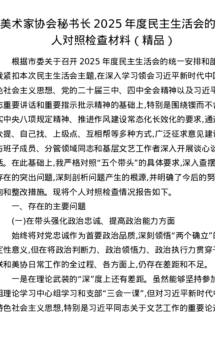 美术家协会秘书长2025年度xxxxx的个人对照检查材料