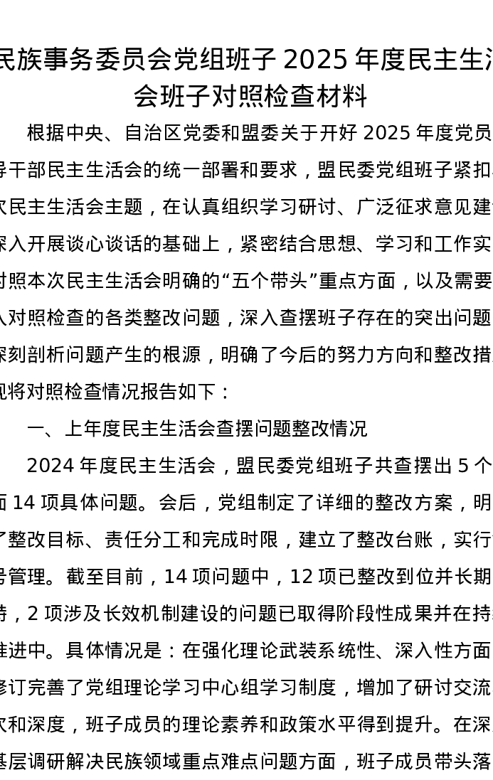 民族事务委员会党组班子2025年度xxxxx班子对照检查材料