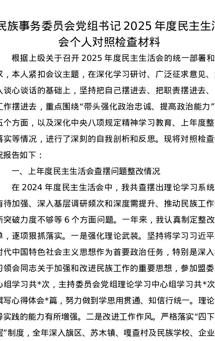 民族事务委员会党组书记2025年度xxxxx个人对照检查材料