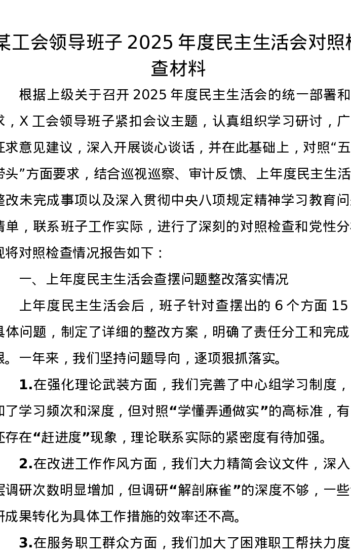某工会领导班子2025年度xxxxx对照检查材料
