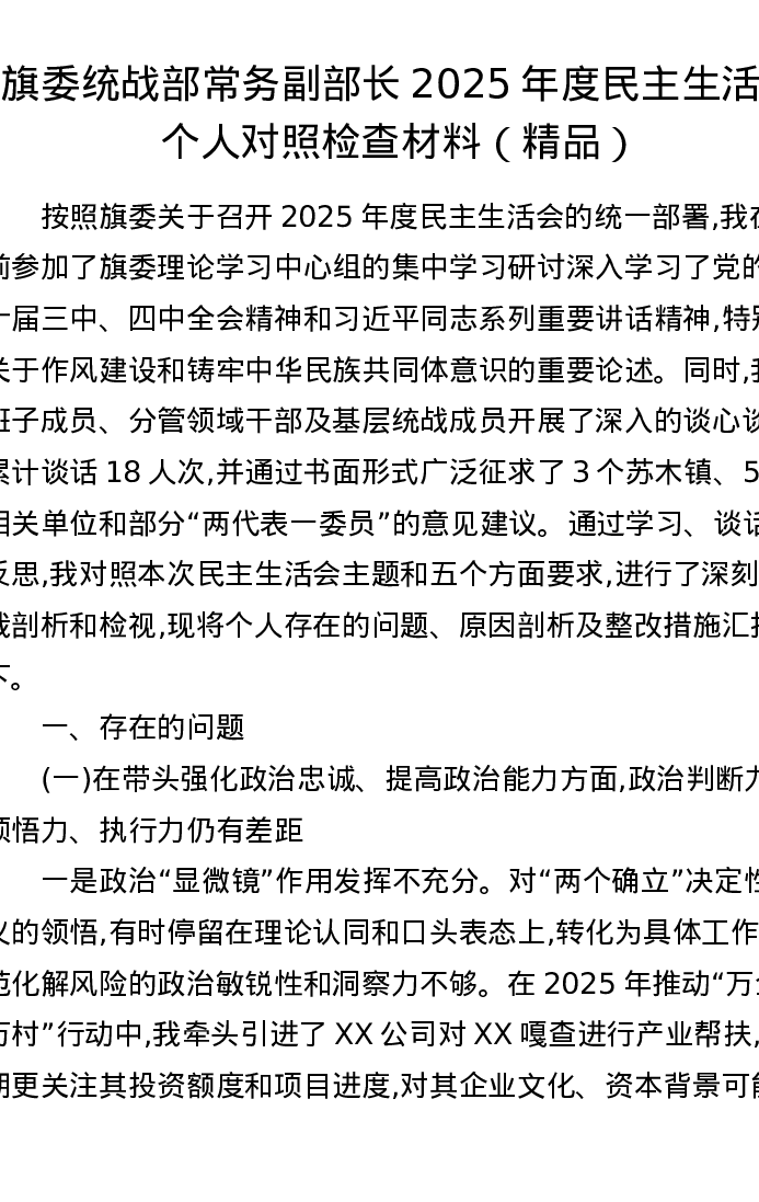 旗委统战部常务副部长2025年度xxxxx个人对照检查材料