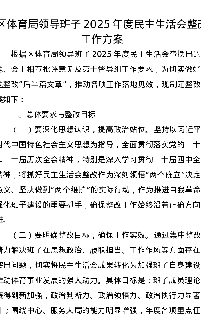 区体育局领导班子2025年度xxxxx整改工作方案