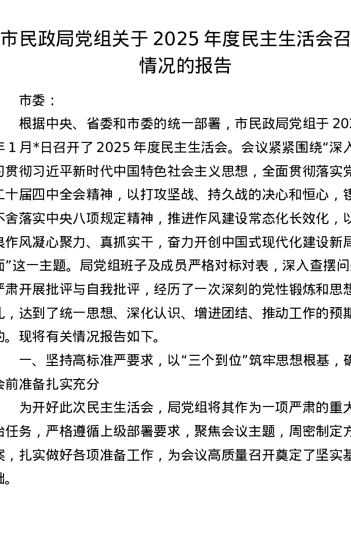 市民政局党组关于2025年度xxxxx召开情况的报告