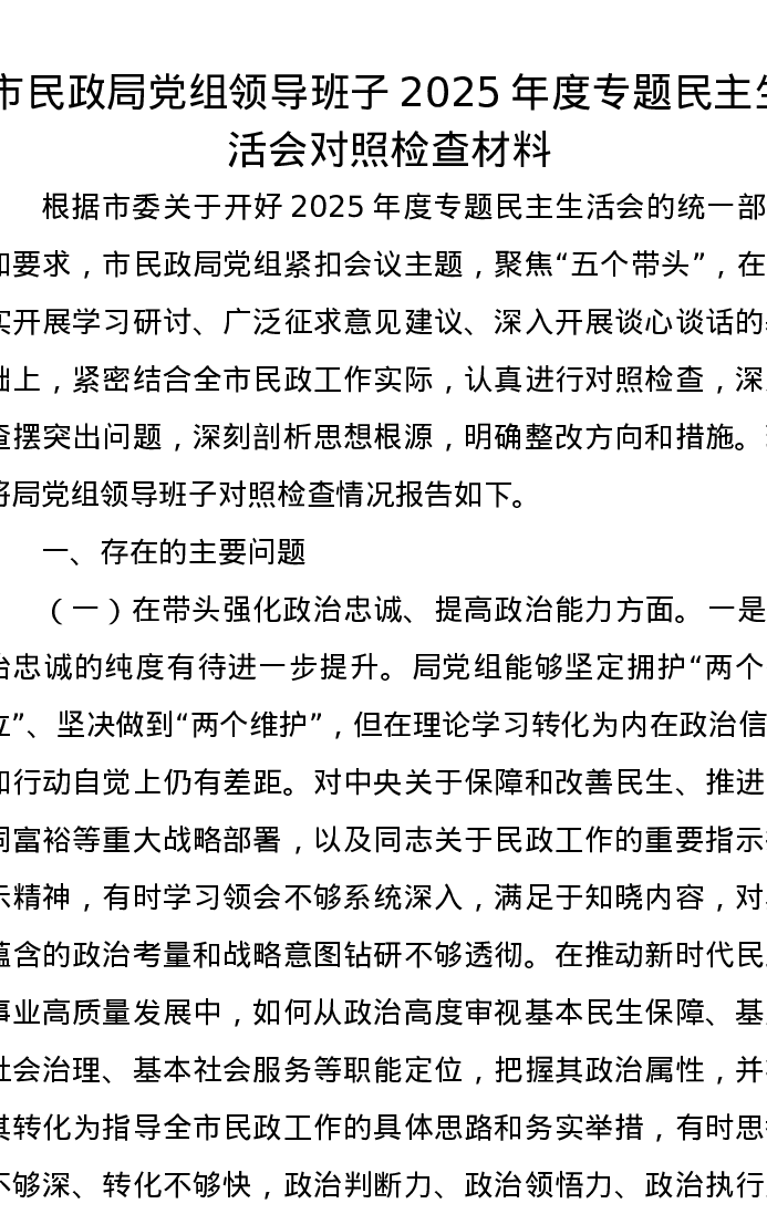 市民政局党组领导班子2025年度专题xxxxx对照检查材料
