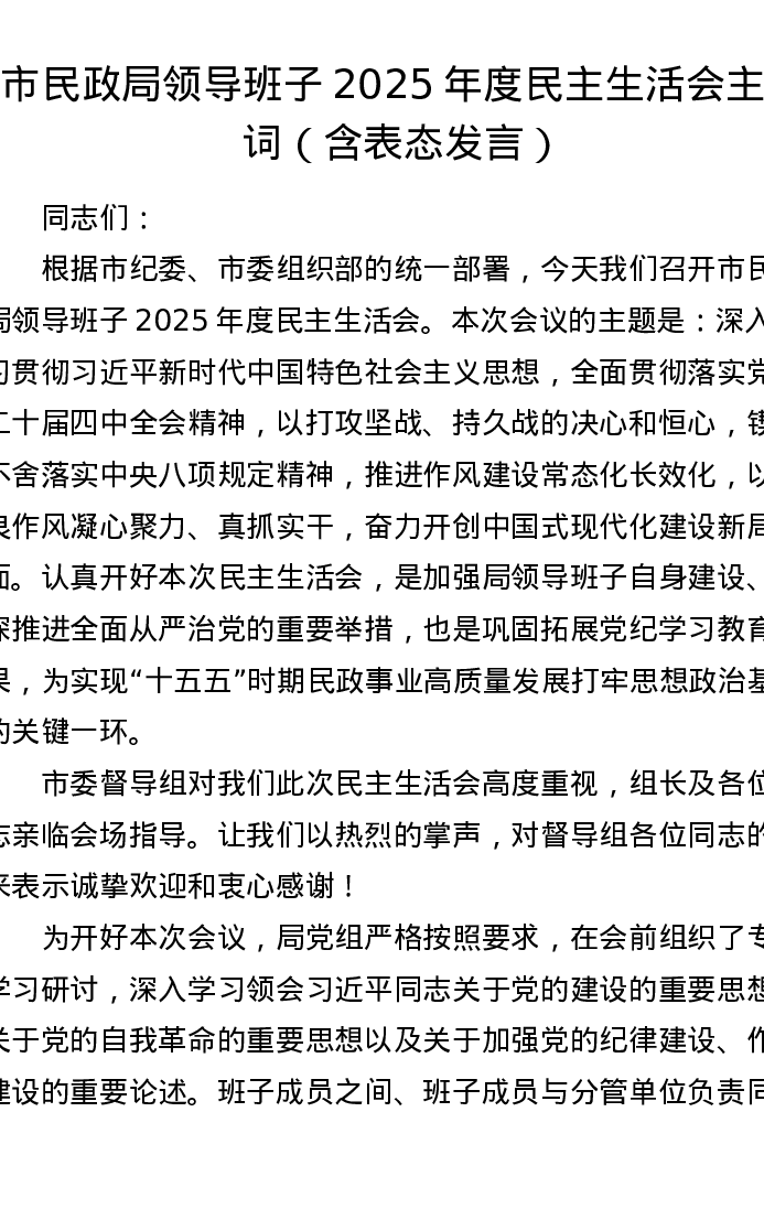 市民政局领导班子2025年度xxxxx主持词(含表态发言)