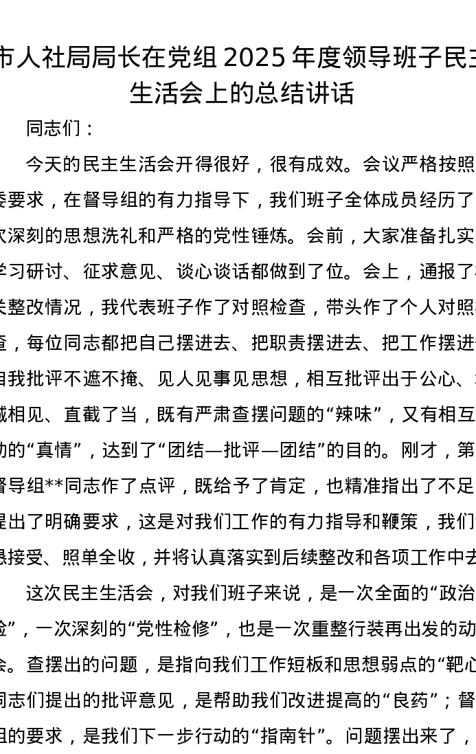 市人社局局长在党组2025年度领导班子xxxxx上的总结讲话