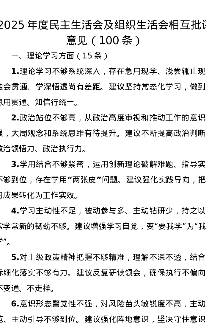 2025年度xxxxx及组织xxx相互批评意见(100条)