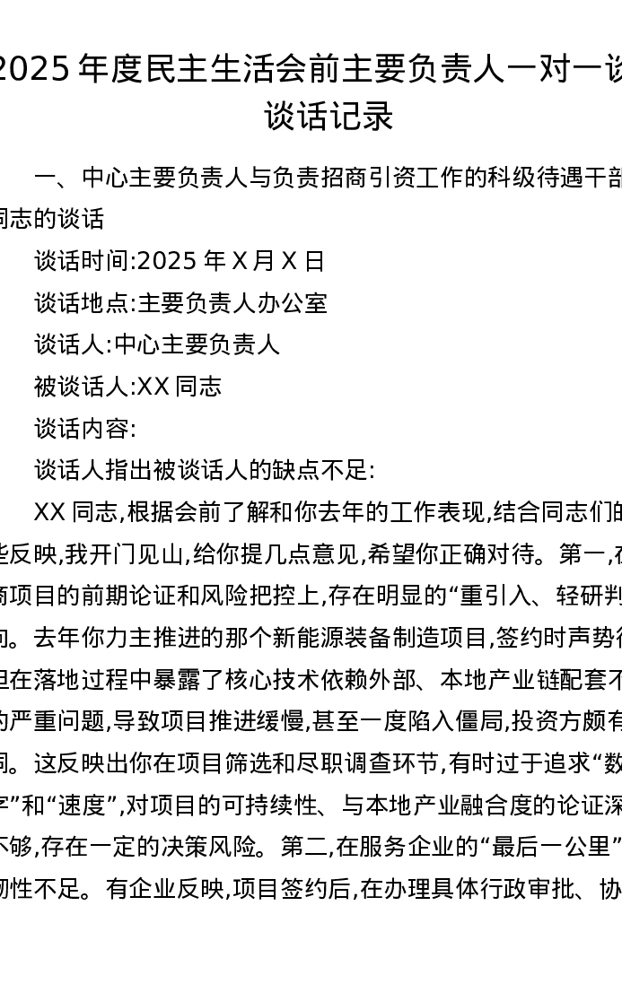 2025年度xxxxx前主要负责人一对一谈心谈话记录