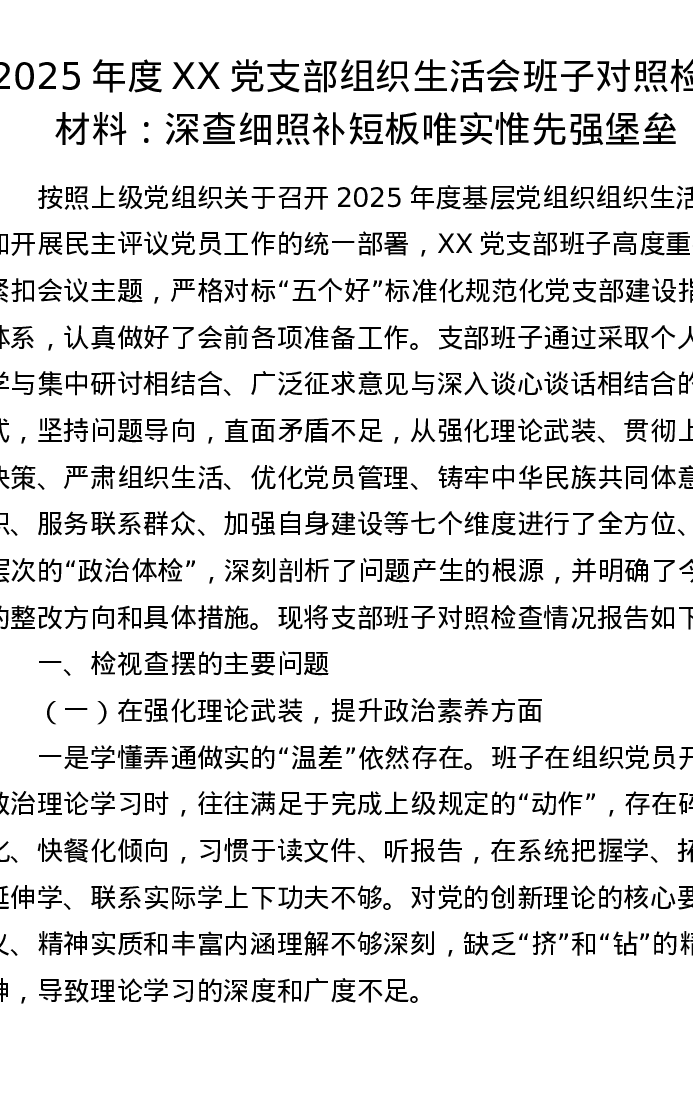 2025年度XX党支部组织xxx班子对照检查材料:深查细照补短板 唯实惟先强堡垒