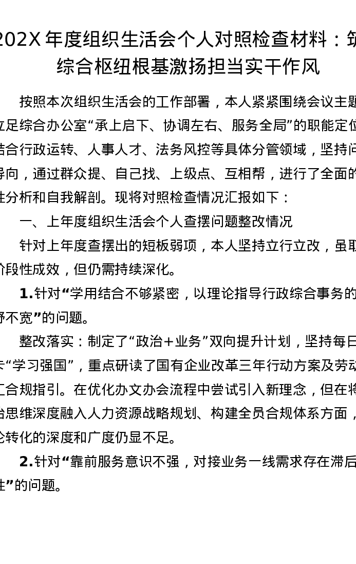 202X年度组织xxx个人对照检查材料:筑牢综合枢纽根基 激扬担当实干作风