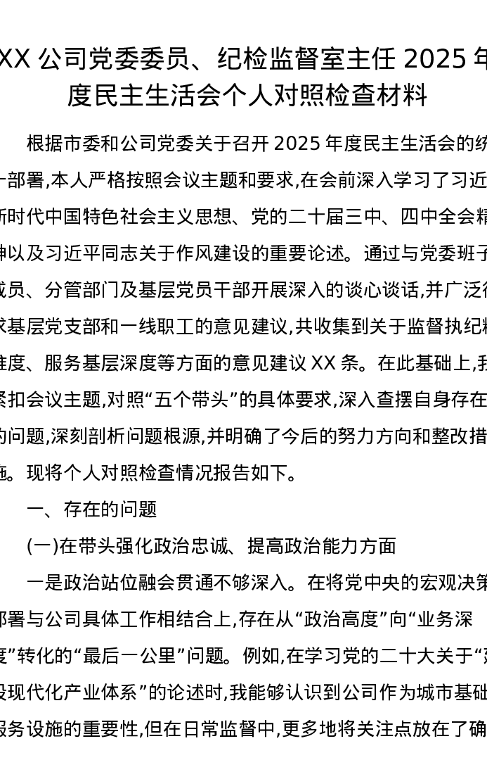 XX公司党委委员、纪检监督室主任2025年度xxxxx个人对照检查材料