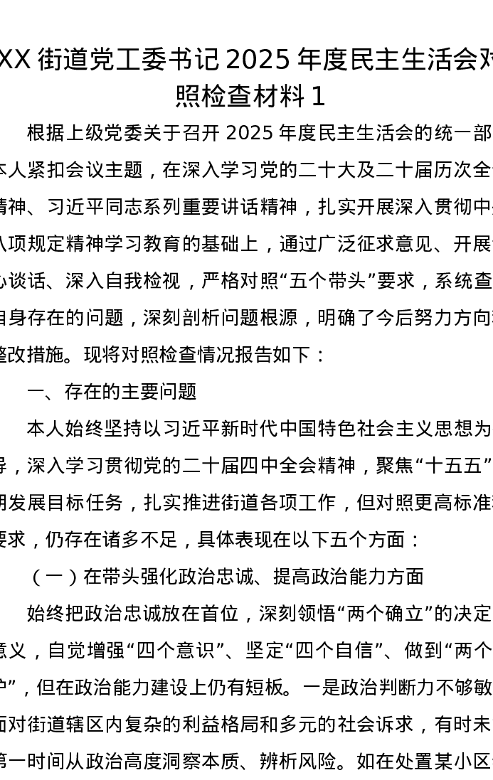 XX街道党工委书记2025年度xxxxx对照检查材料1