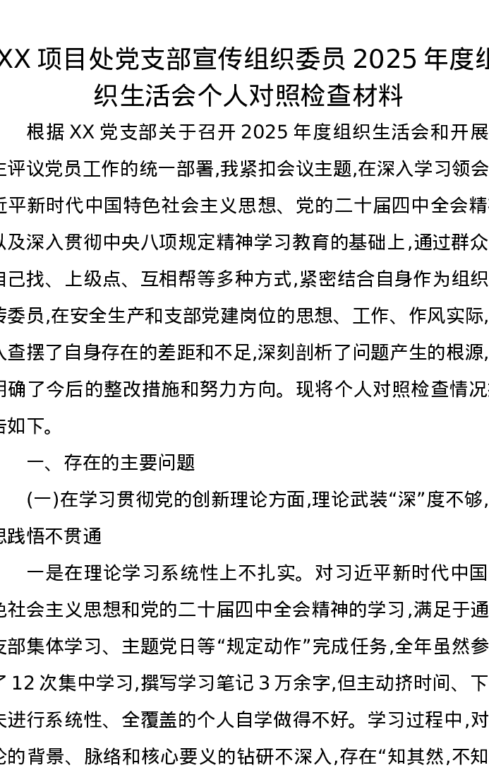 XX项目处党支部宣传组织委员2025年度组织xxx个人对照检查材料