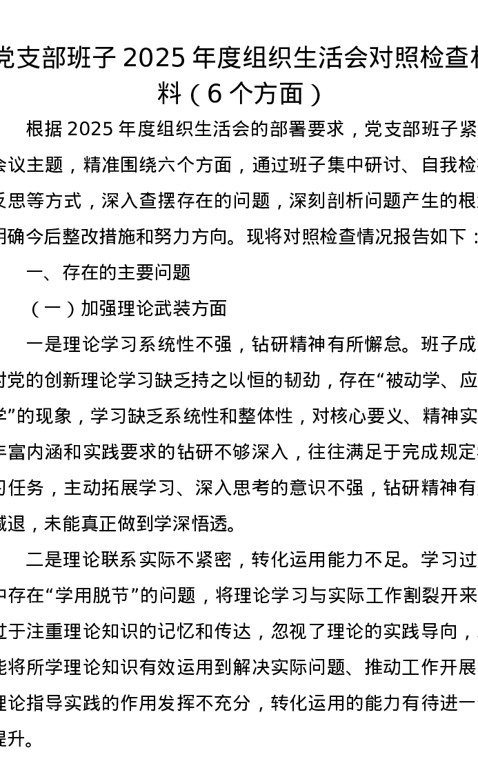 党支部班子2025年度组织xxx对照检查材料(6个方面)