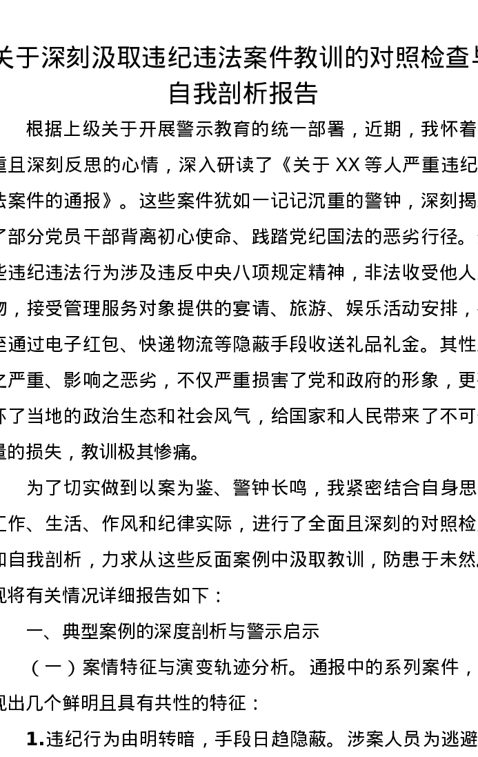 关于深刻汲取违纪违法案件教训的对照检查与自我剖析报告