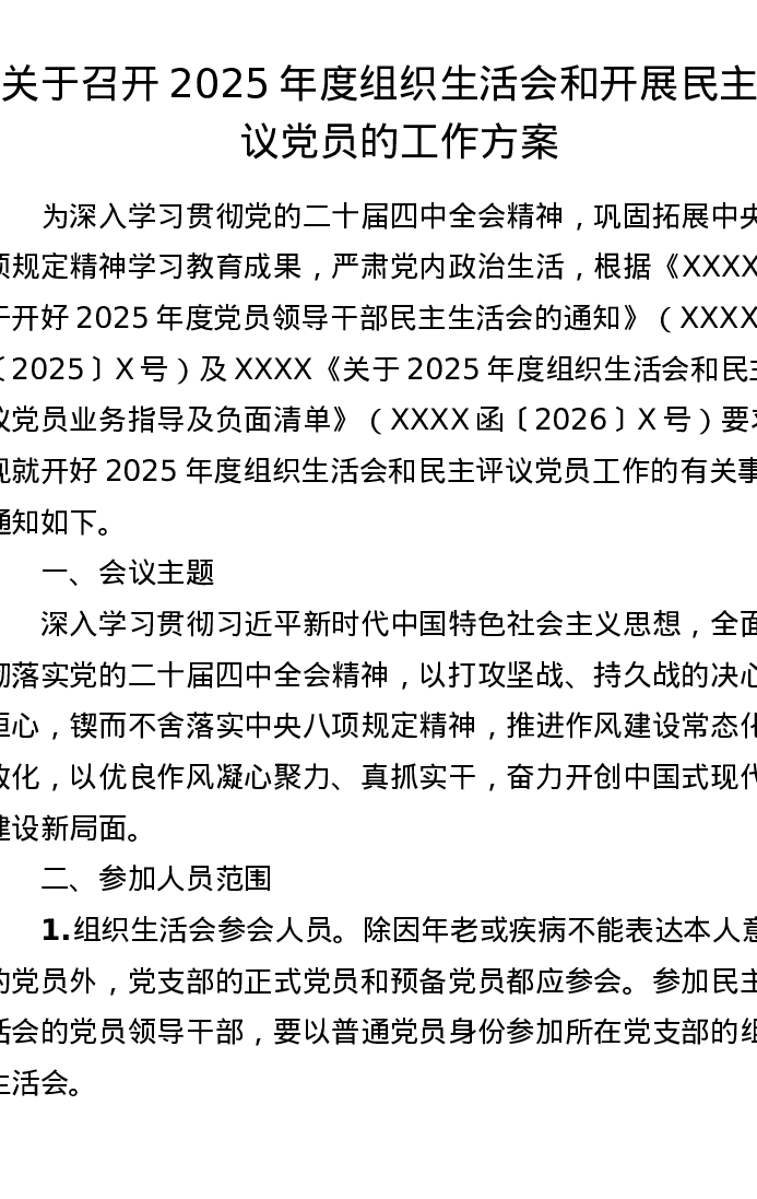 关于召开2025年度组织xxx和开展民主评议党员的工作方案