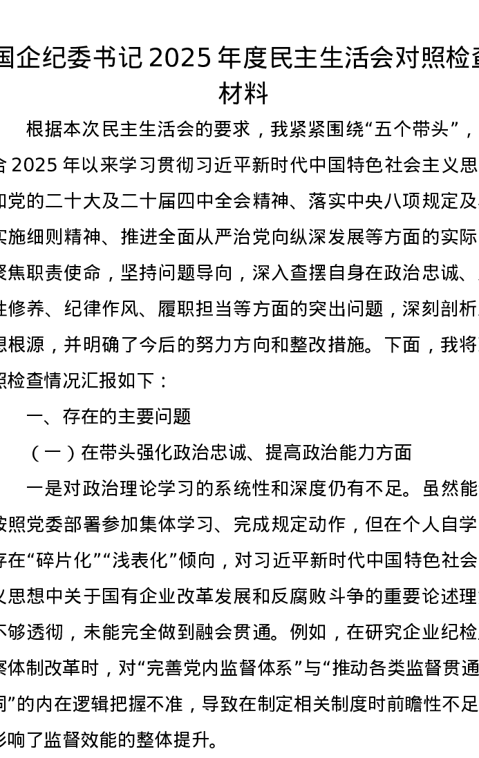 国企纪委书记2025年度xxxxx对照检查材料
