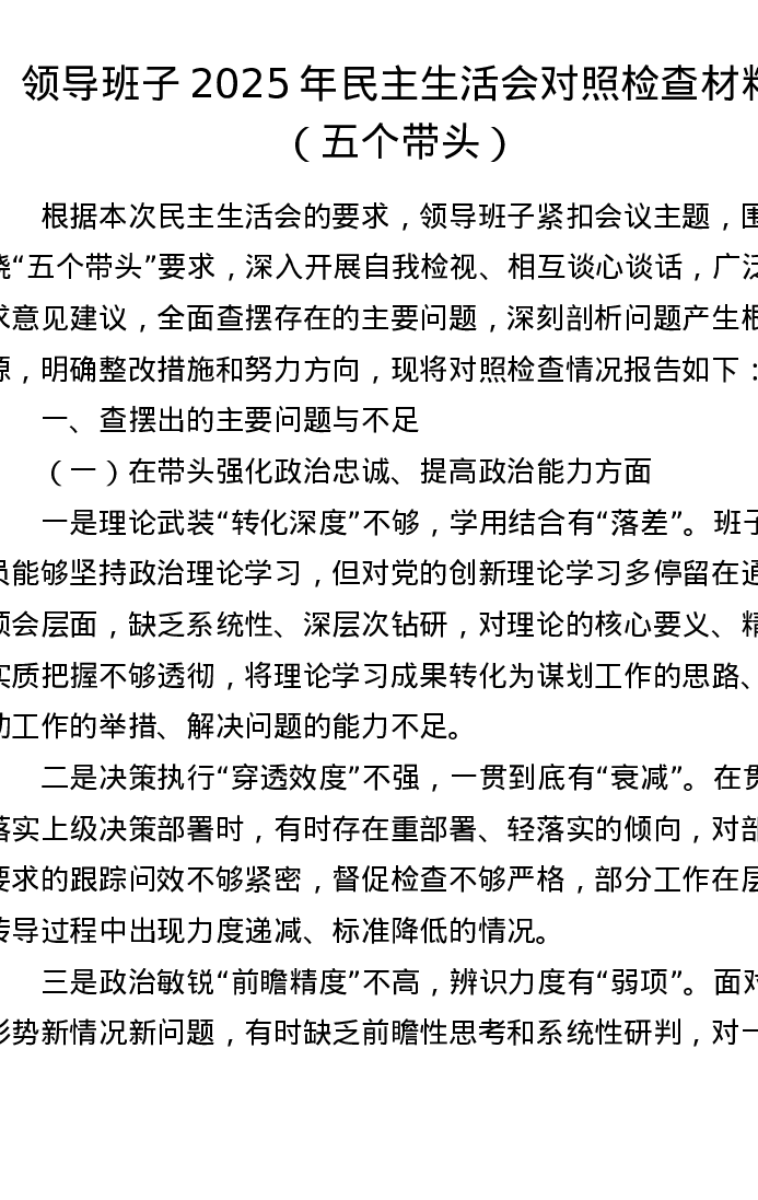 领导班子2025年xxxxx对照检查材料(五个带头)
