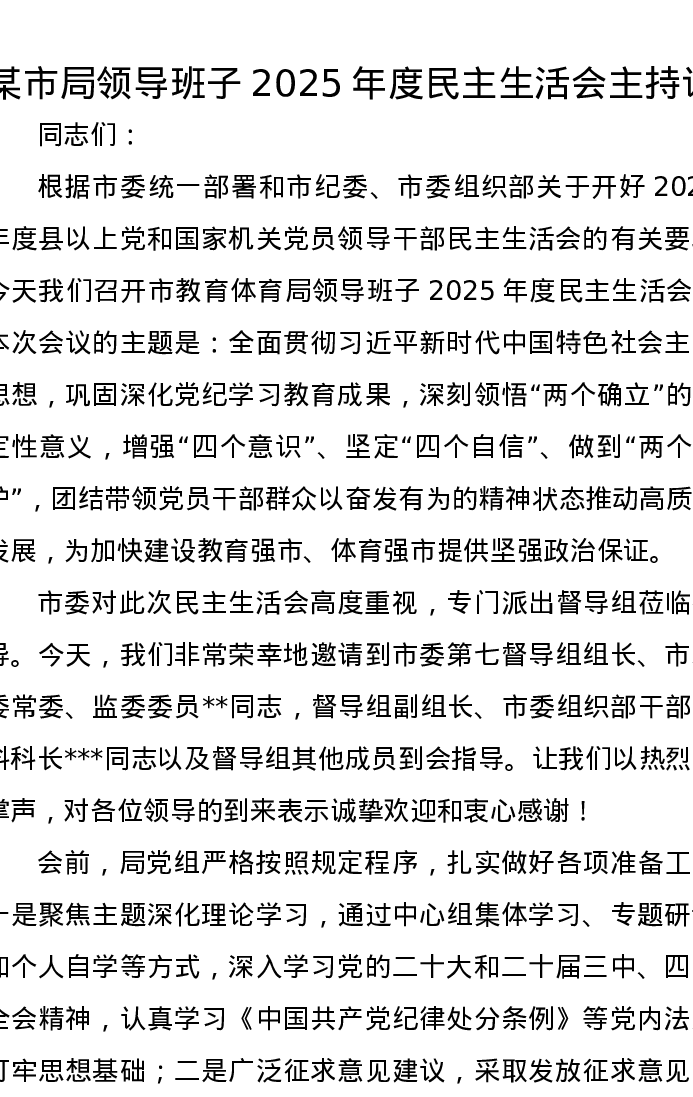 某市局领导班子2025年度xxxxx主持词