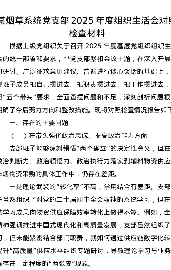 某烟草系统党支部2025年度组织xxx对照检查材料