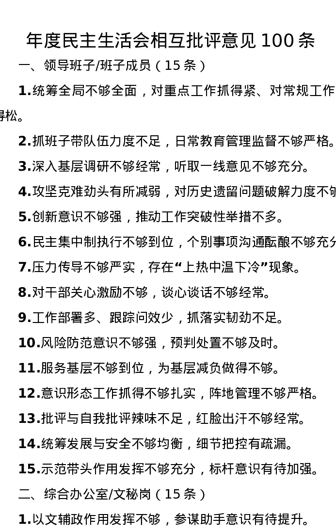 年度xxxxx相互批评意见100条