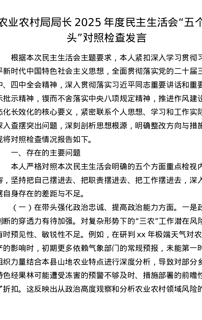 农业农村局局长2025年度xxxxx五个带头对照检查发言