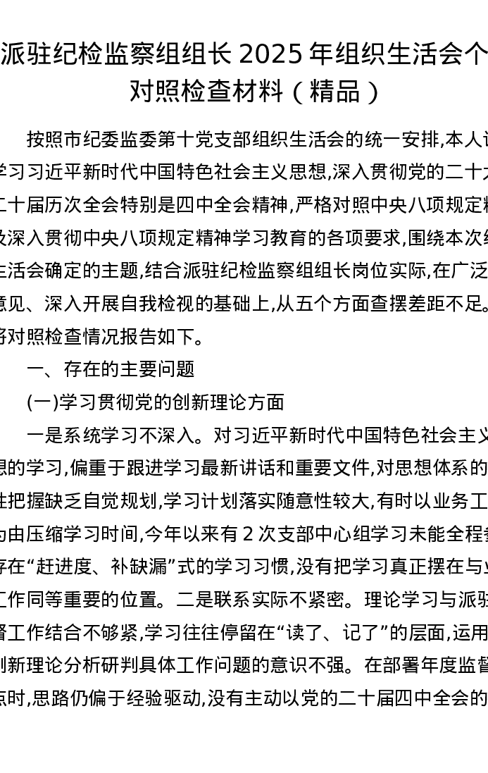 派驻纪检监察组组长2025年组织xxx个人对照检查材料