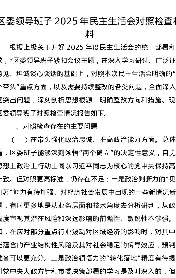 区委领导班子2025年xxxxx对照检查材料