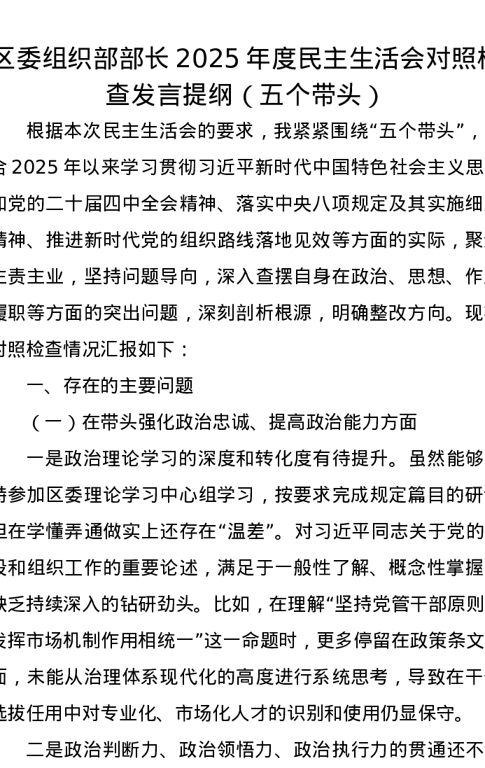 区委组织部部长2025年度xxxxx对照检查发言提纲(五个带头)