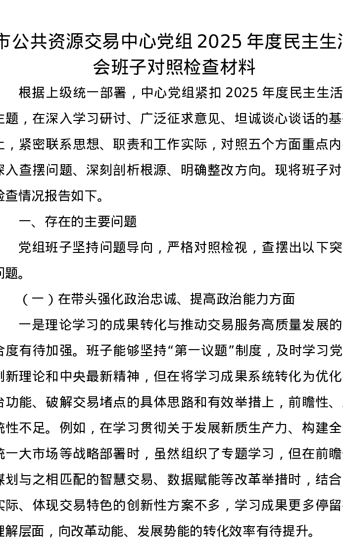市公共资源交易中心党组2025年度xxxxx班子对照检查材料