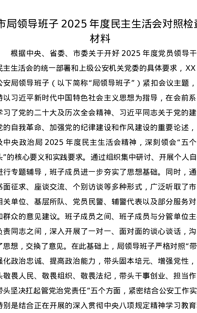 市局领导班子2025年度xxxxx对照检查材料