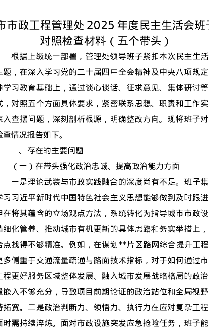 市市政工程管理处2025年度xxxxx班子对照检查材料(五个带头)