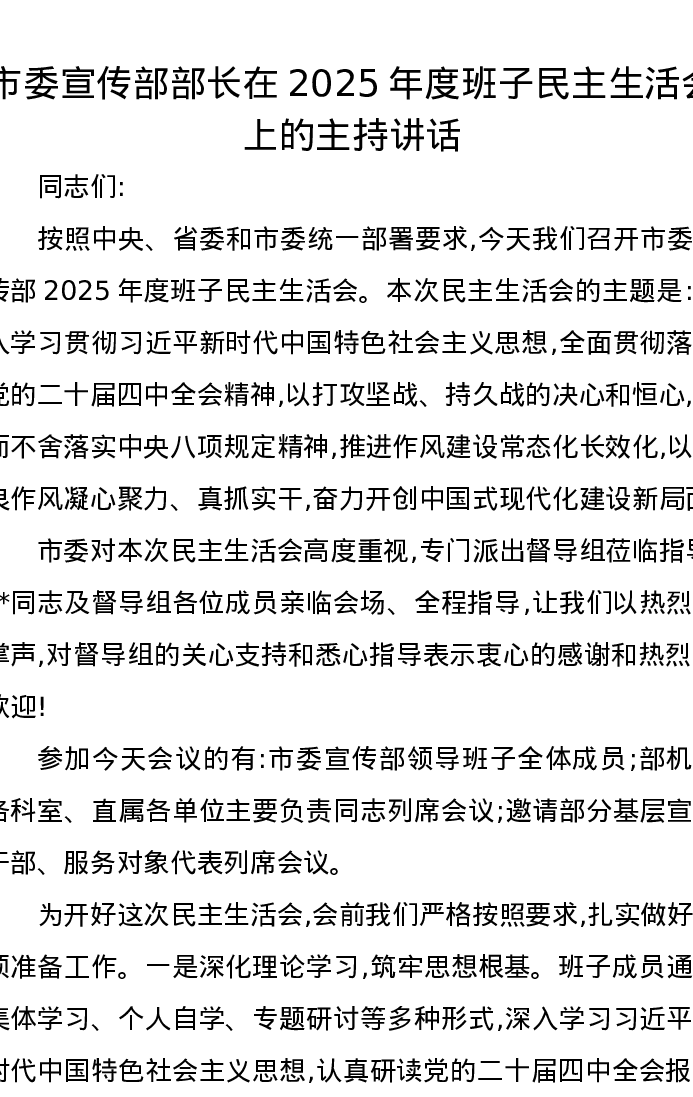 市委宣传部部长在2025年度班子xxxxx上的主持讲话