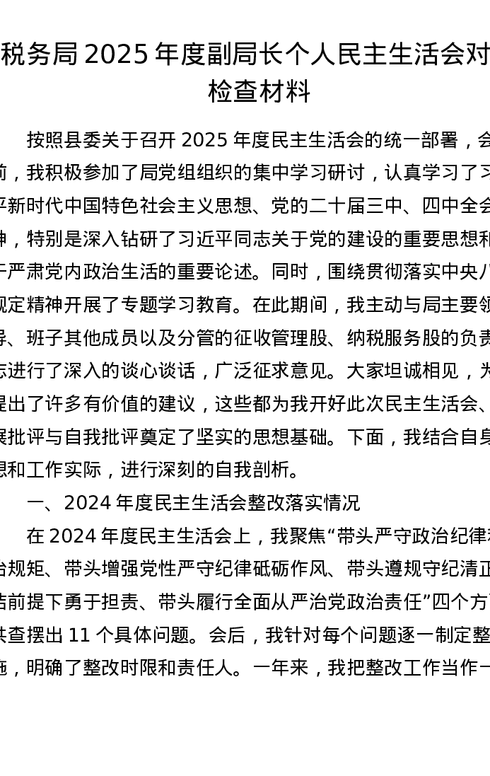税务局2025年度副局长个人xxxxx对照检查材料