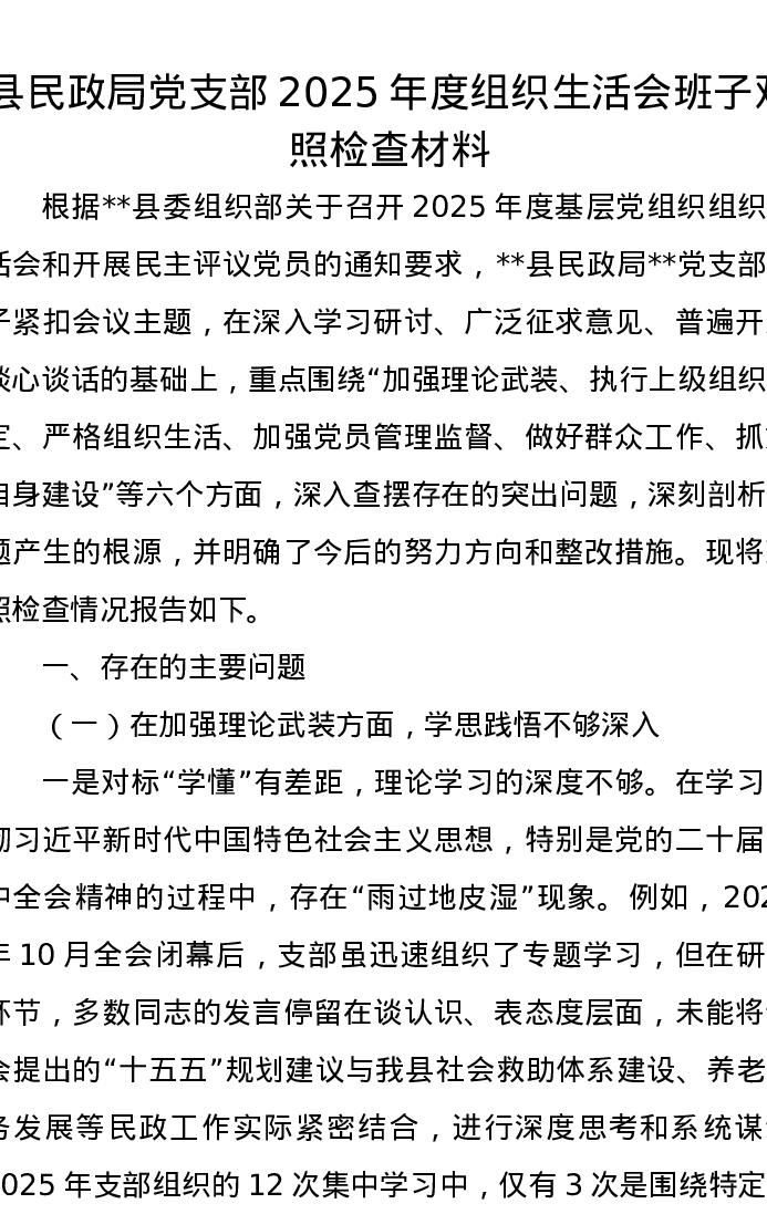县民政局党支部2025年度组织xxx班子对照检查材料
