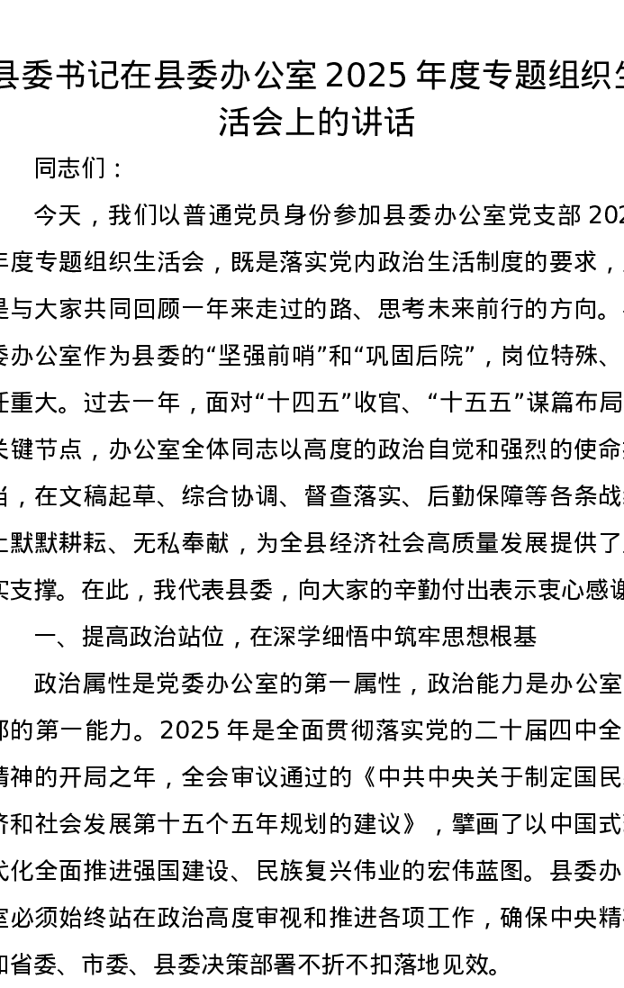 县委书记在县委办公室2025年度专题组织xxx上的讲话