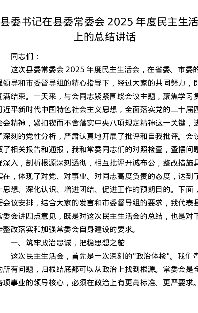 县委书记在县委常委会2025年度xxxxx上的总结讲话