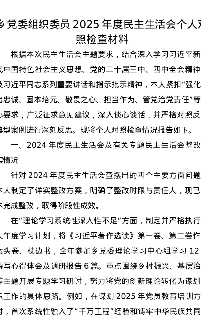 乡党委组织委员2025年度xxxxx个人对照检查材料