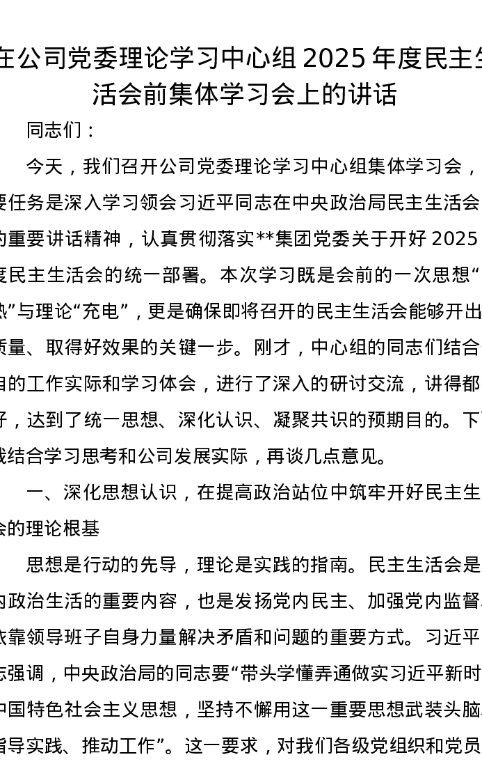 在公司党委理论学习中心组2025年度xxxxx前集体学习会上的讲话