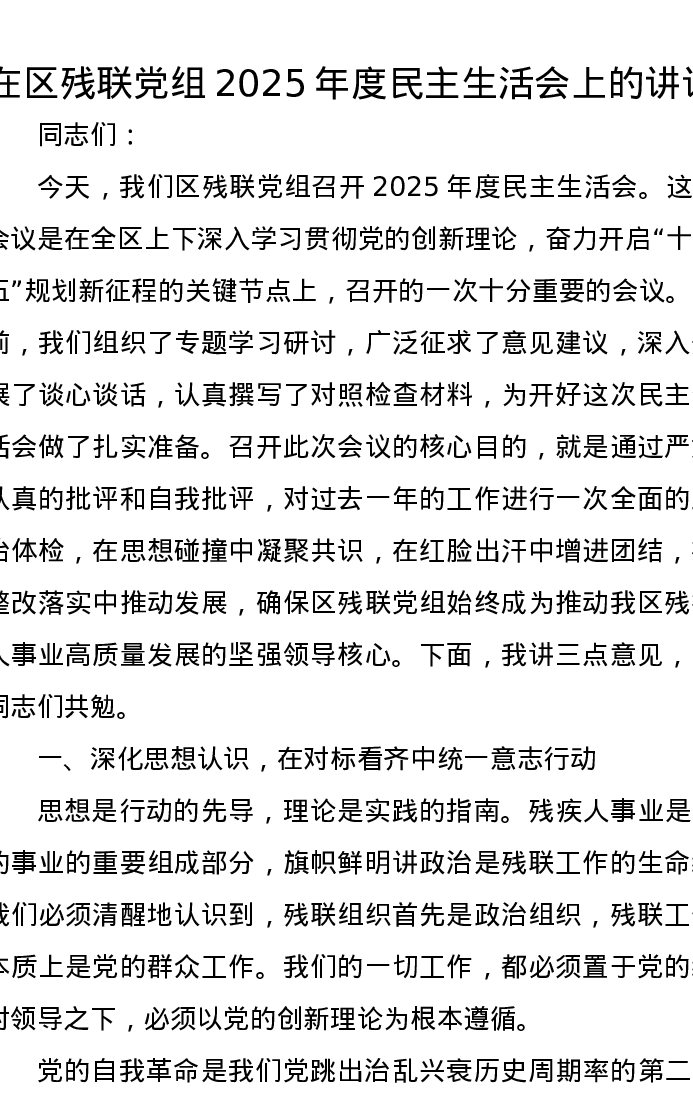 在区残联党组2025年度xxxxx上的讲话