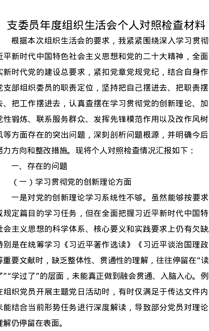 支委员年度组织xxx个人对照检查材料