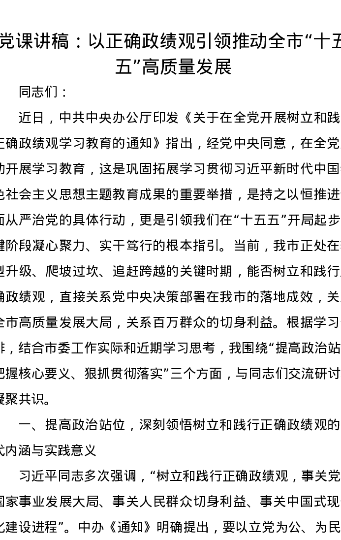 党课讲稿:以正确政绩观引领推动全市十五五高质量发展