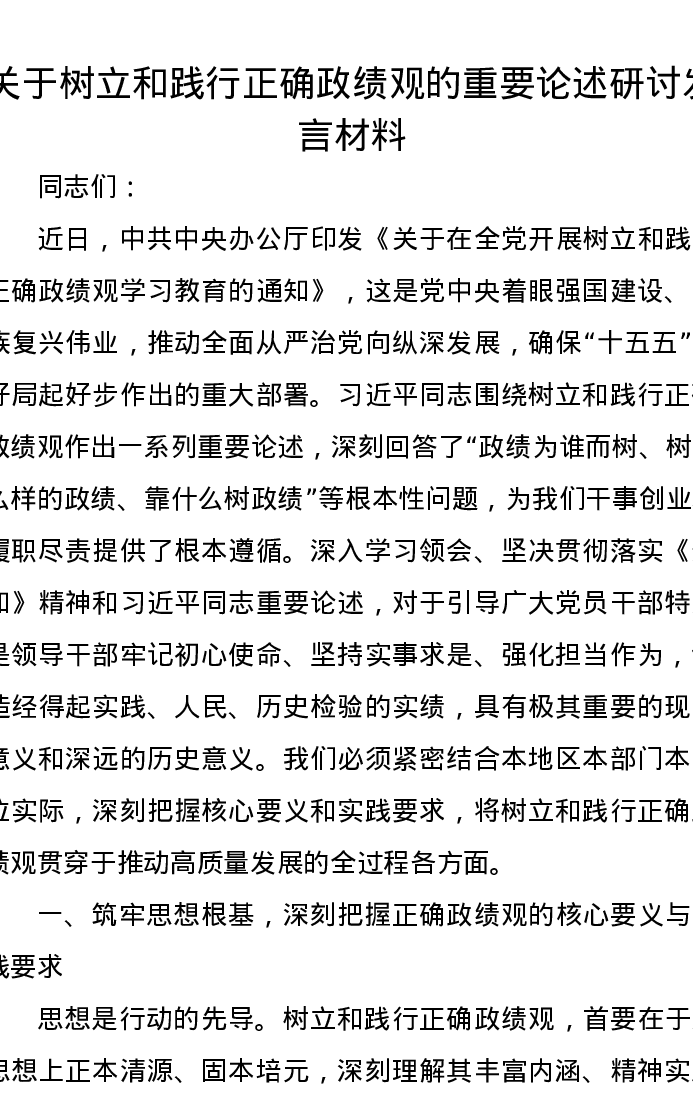 关于树立和践行正确政绩观的重要论述研讨发言材料