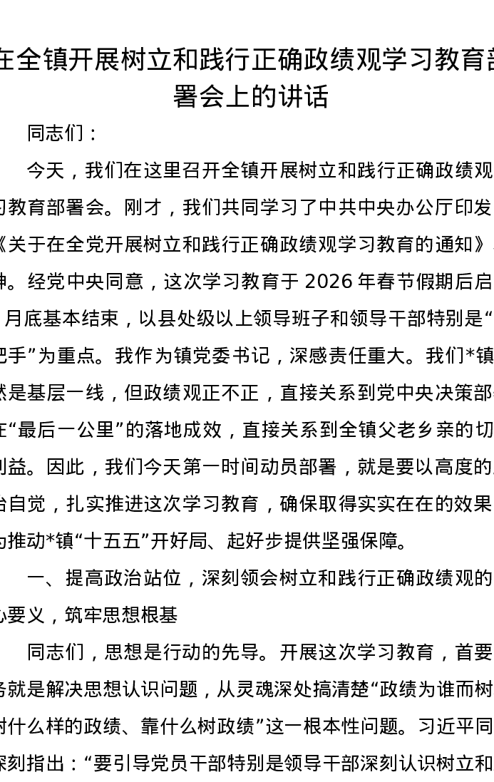 在全镇开展树立和践行正确政绩观学习教育部署会上的讲话