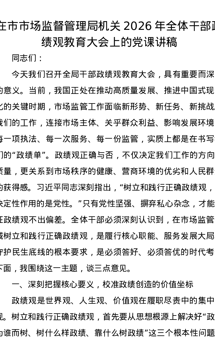 在市市场监督管理局机关2026年全体干部政绩观教育大会上的党课讲稿