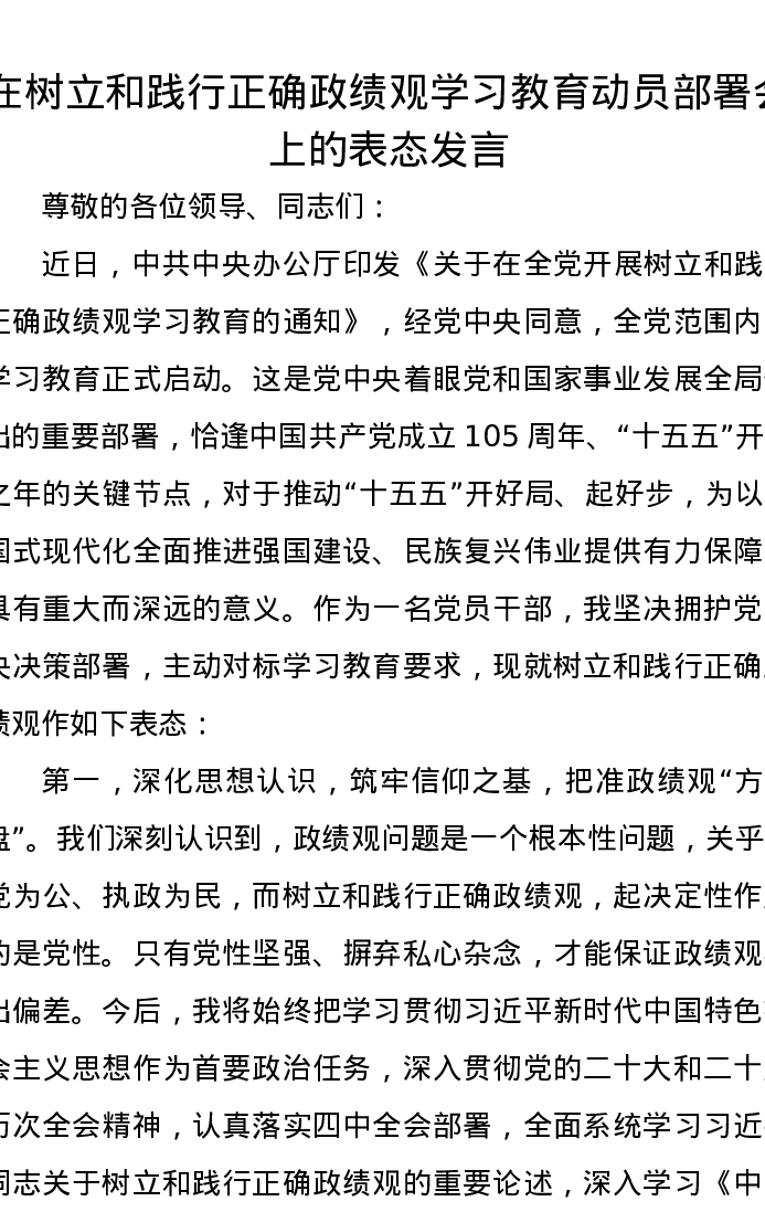 在树立和践行正确政绩观学习教育动员部署会上的表态发言