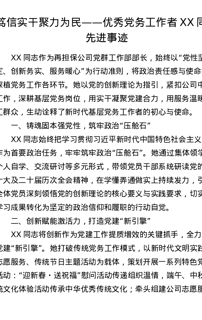 笃信实干 聚力为民——优秀党务工作者XX同志先进事迹