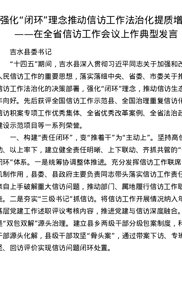 强化闭环理念 推动信访工作法治化提质增效——在全省信访工作会议上作典型发言