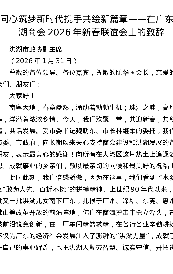 同心筑梦新时代携手共绘新篇章——在广东洪湖商会2026年新春联谊会上的致辞